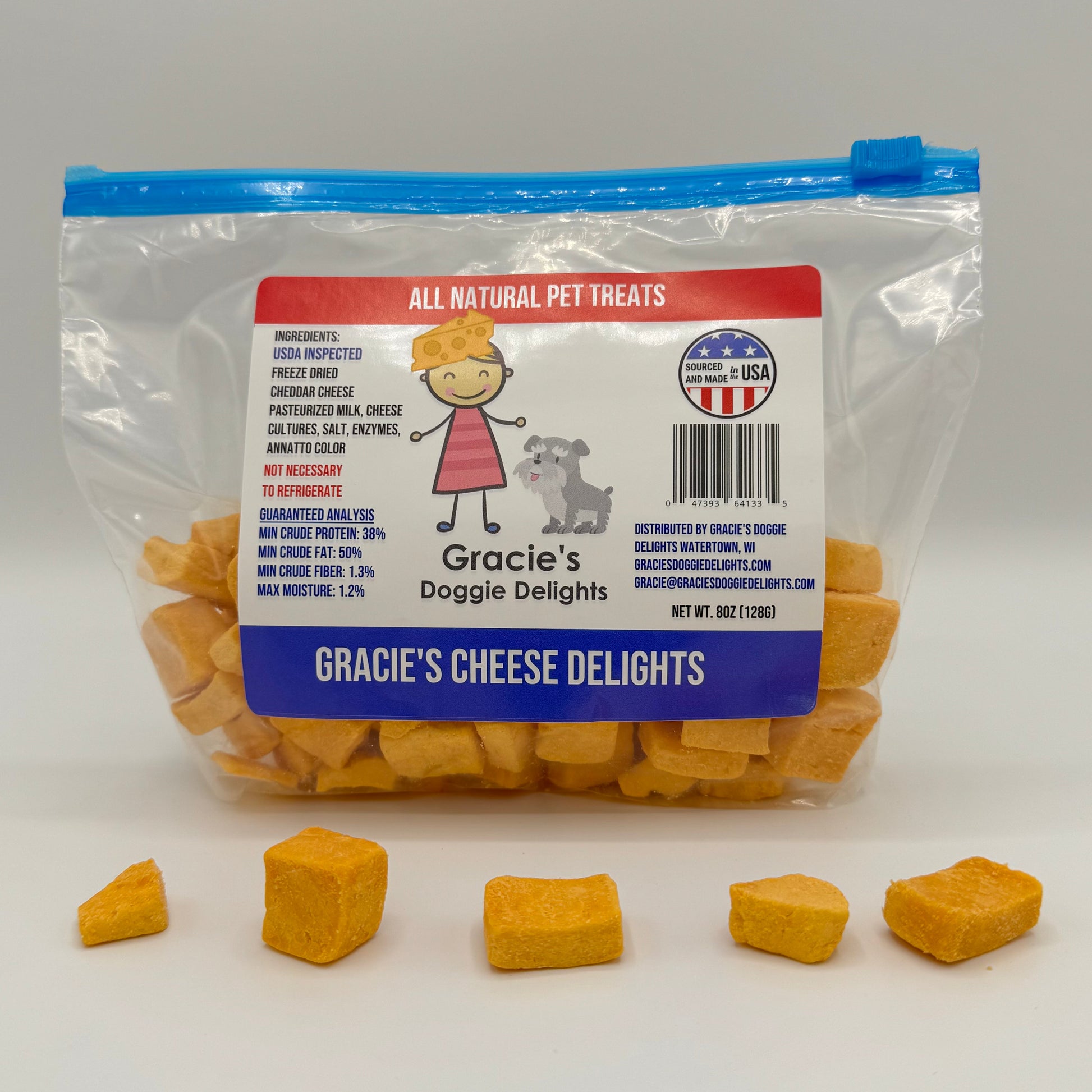 100% Wisconsin Cheddar Cheese! These dog treats are Freeze Dried, so there is no need to refrigerate. Your dogs will love them! These treats were originally designed for hikers for a quick protein snack that didn't need to be kept cold. The cheese is freeze dried, so it is harder than cheese out of your fridge. Because of that these treats probably won’t work well for dogs with a lot of missing teeth.