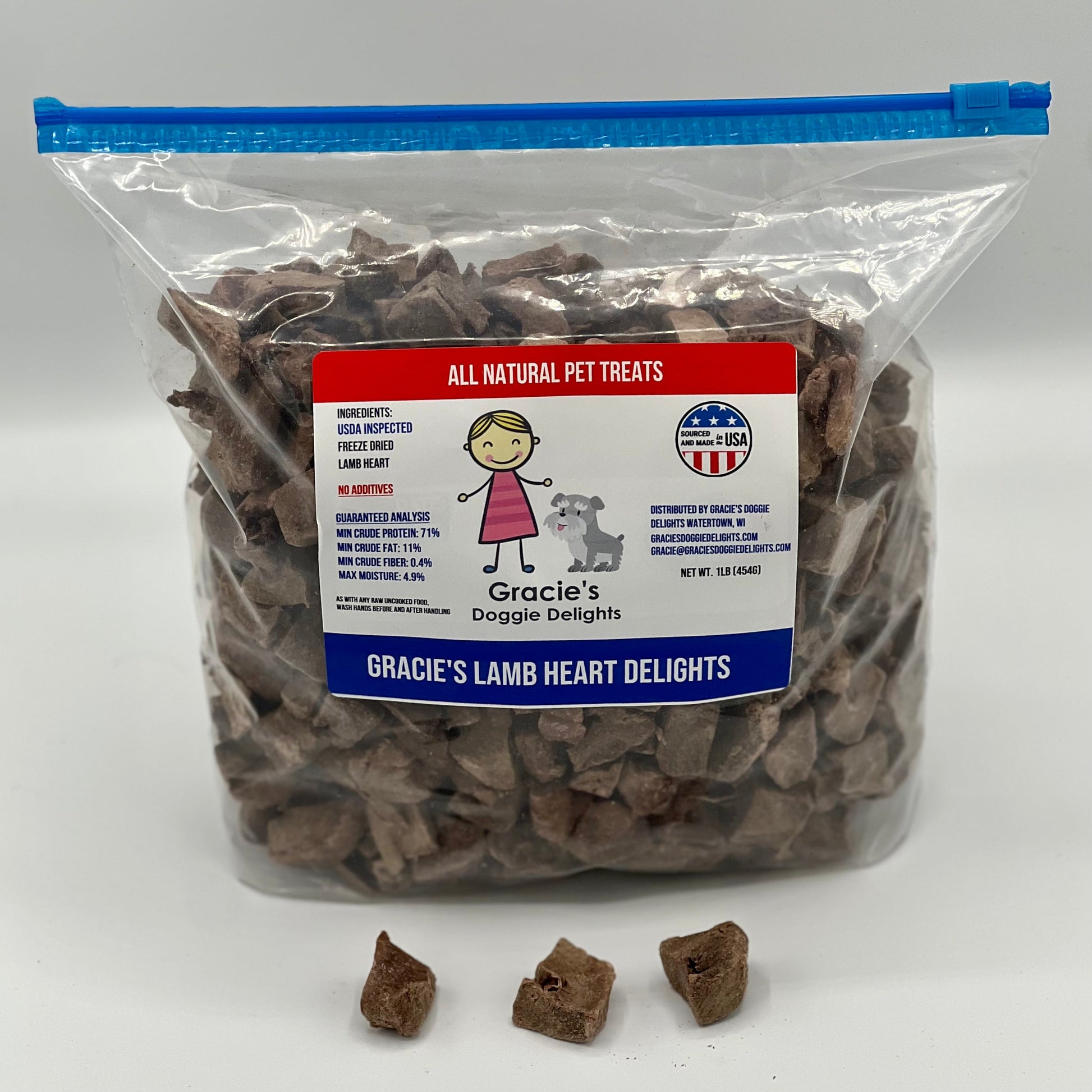Like all our treats, Gracie's Lamb Heart Delights are made from USDA inspected meat freeze dried raw with no additives. The slow freeze drying process locks in the delicious flavor that pets crave with no grains, gluten, chemicals or preservatives. It's a raw food treat without the mess. They're the treats pets love and you'll love giving.