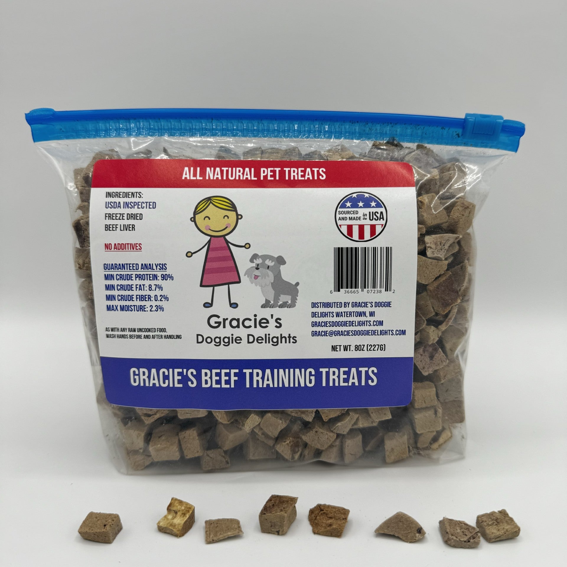 - The Beef Training Treats are smaller version of our Beef Liver Doggie Delights. Beef liver is a great source of quality protein, all of the B vitamins and is the most concentrated source of Vitamin A.