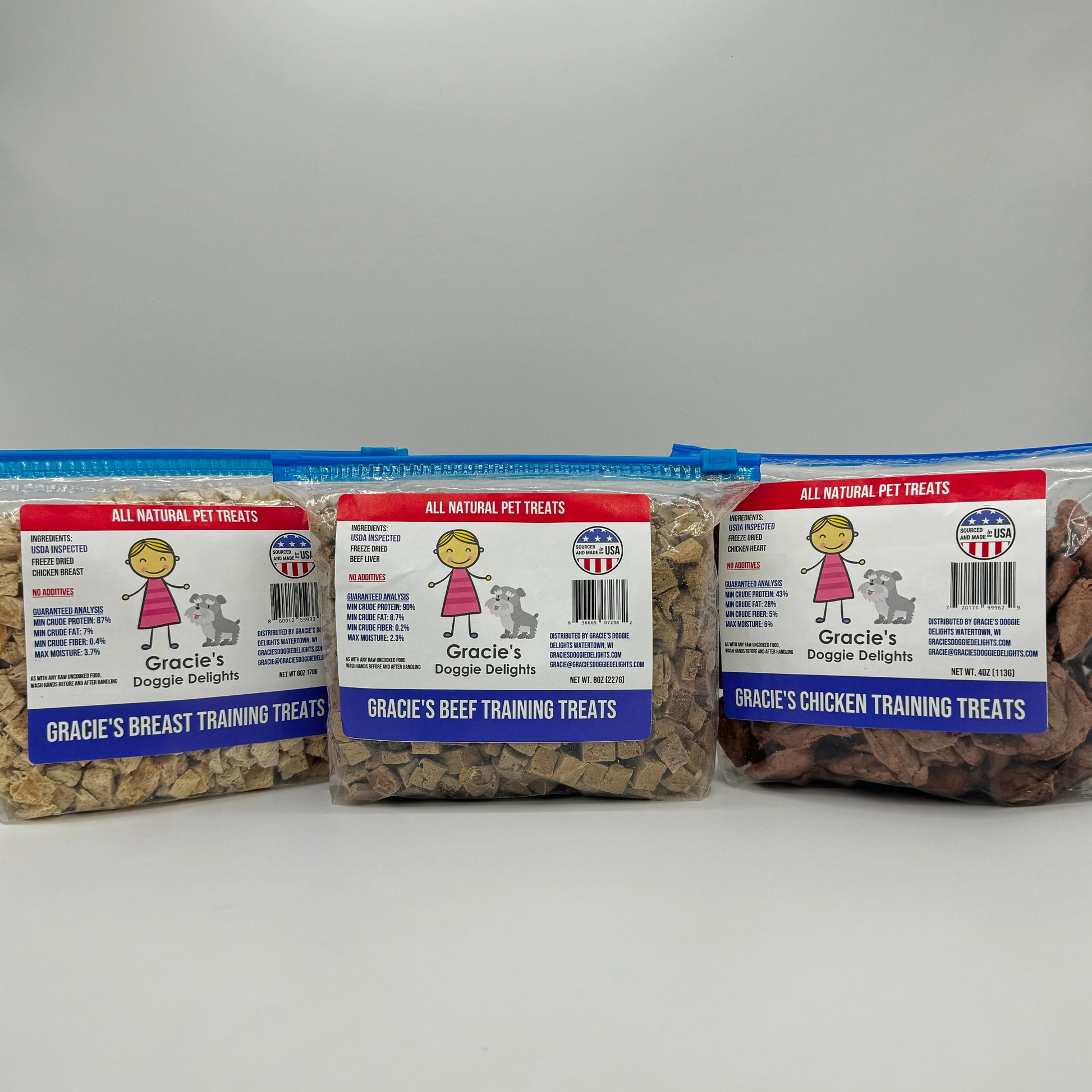 Gracie's Training Treats come in three different flavors. These freeze dried treats are great for training your dog because they are small and are perfect for when multiple treats are needed for training. They are also great for smaller dogs, puppies or cats.