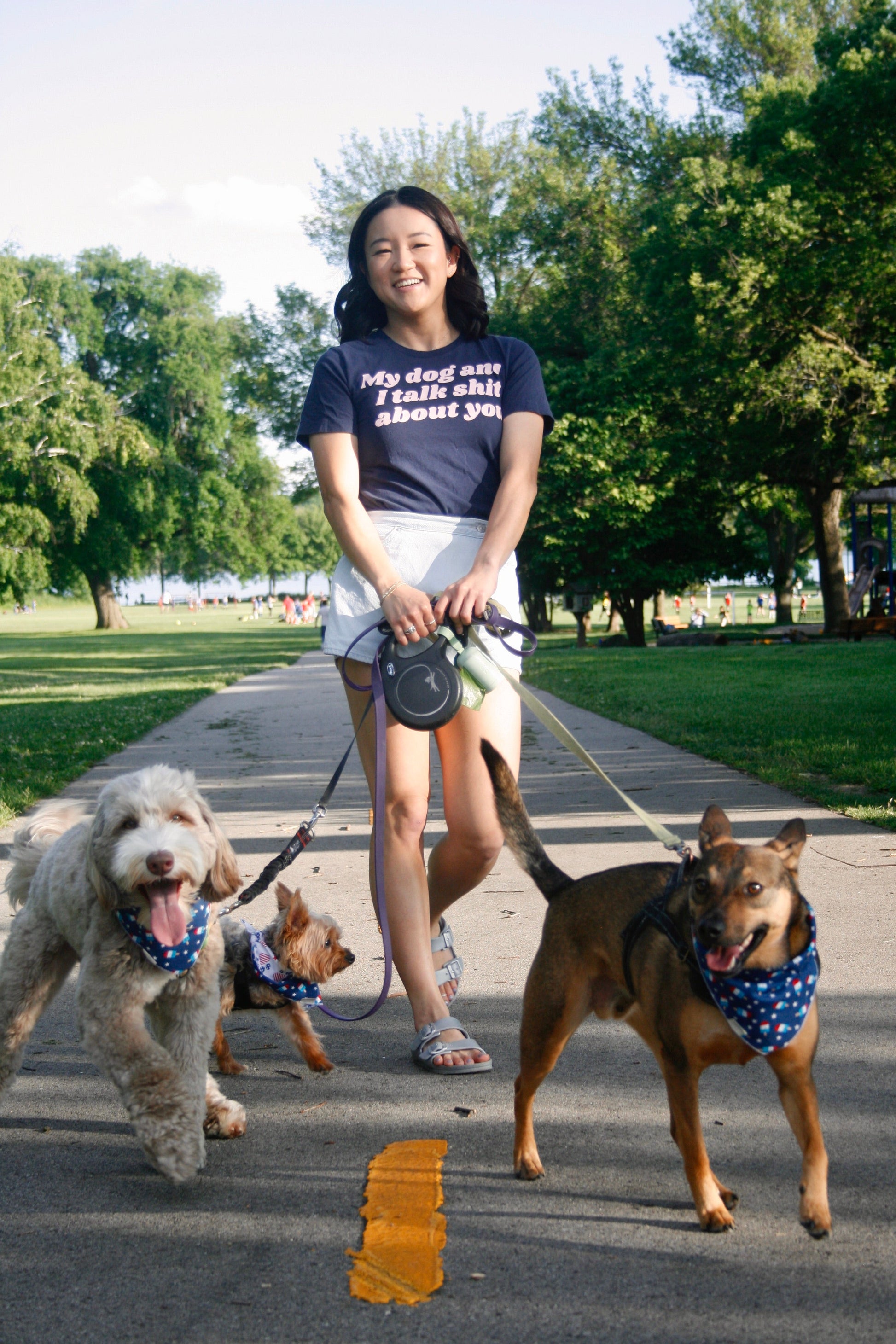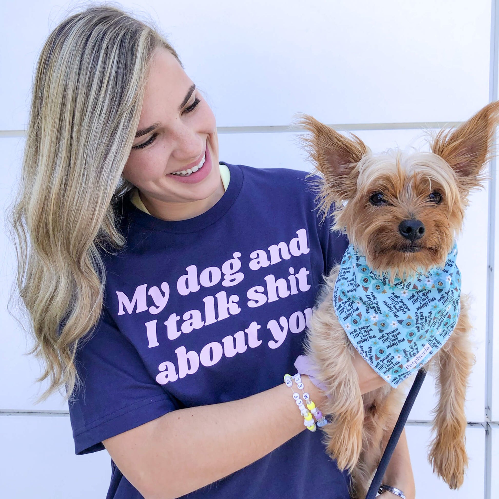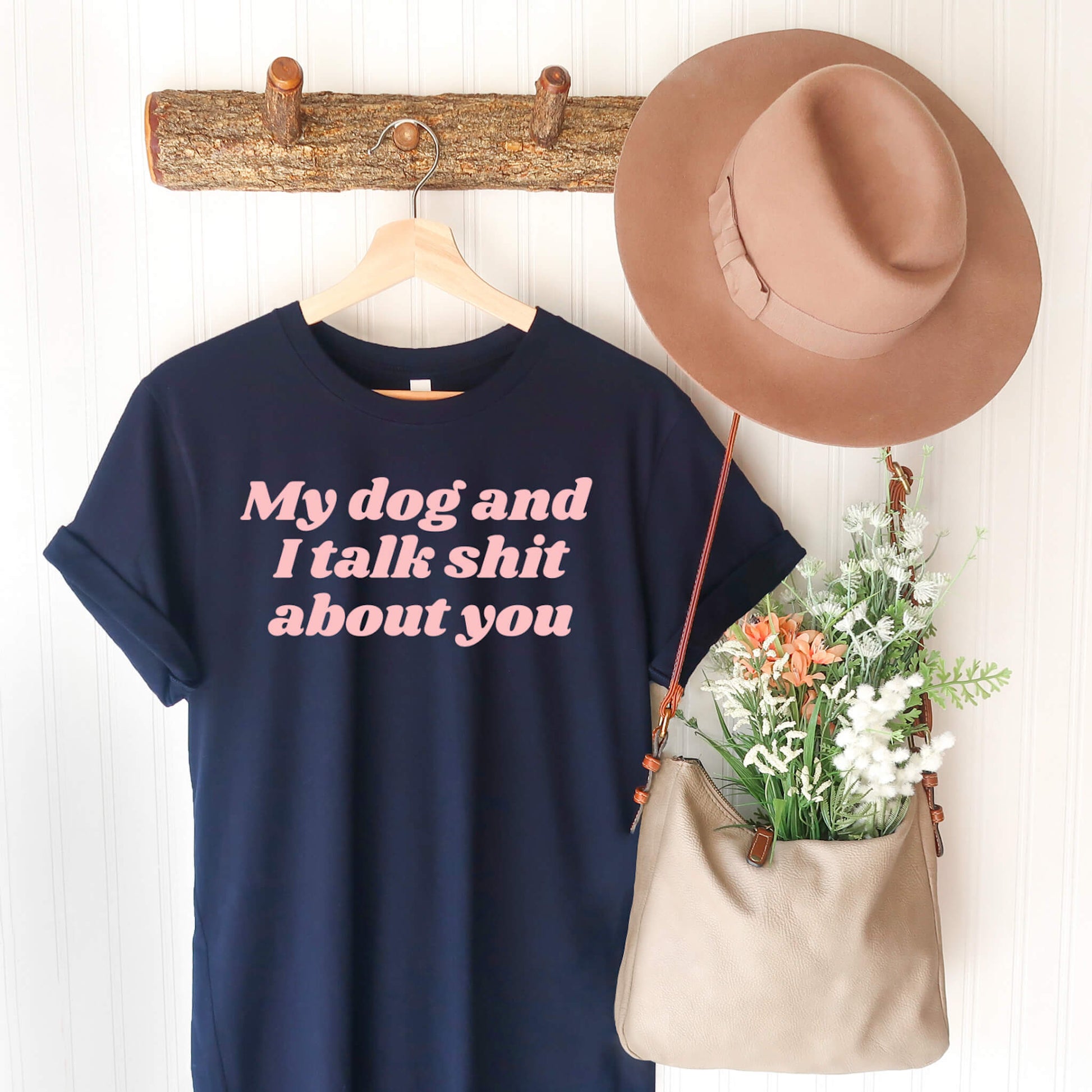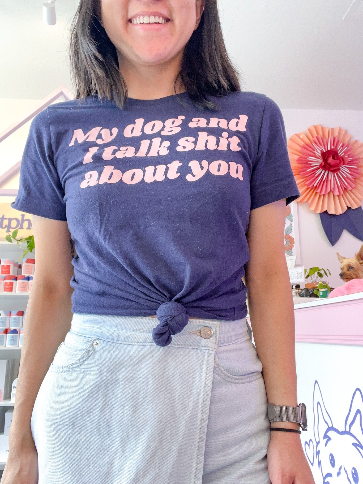 What’s not to love about our talk shit t shirt? It’s perfect for days when you need a little extra boost, and it always puts a smile on your dog’s face. The navy tee has light pink writing that reads “My dog and I talk shit about you,” making it the perfect way to show off your sense of humor. Whether you’re taking a walk in the park or just lounging around at home, this shirt is sure to turn heads. So why not add it to your wardrobe today?